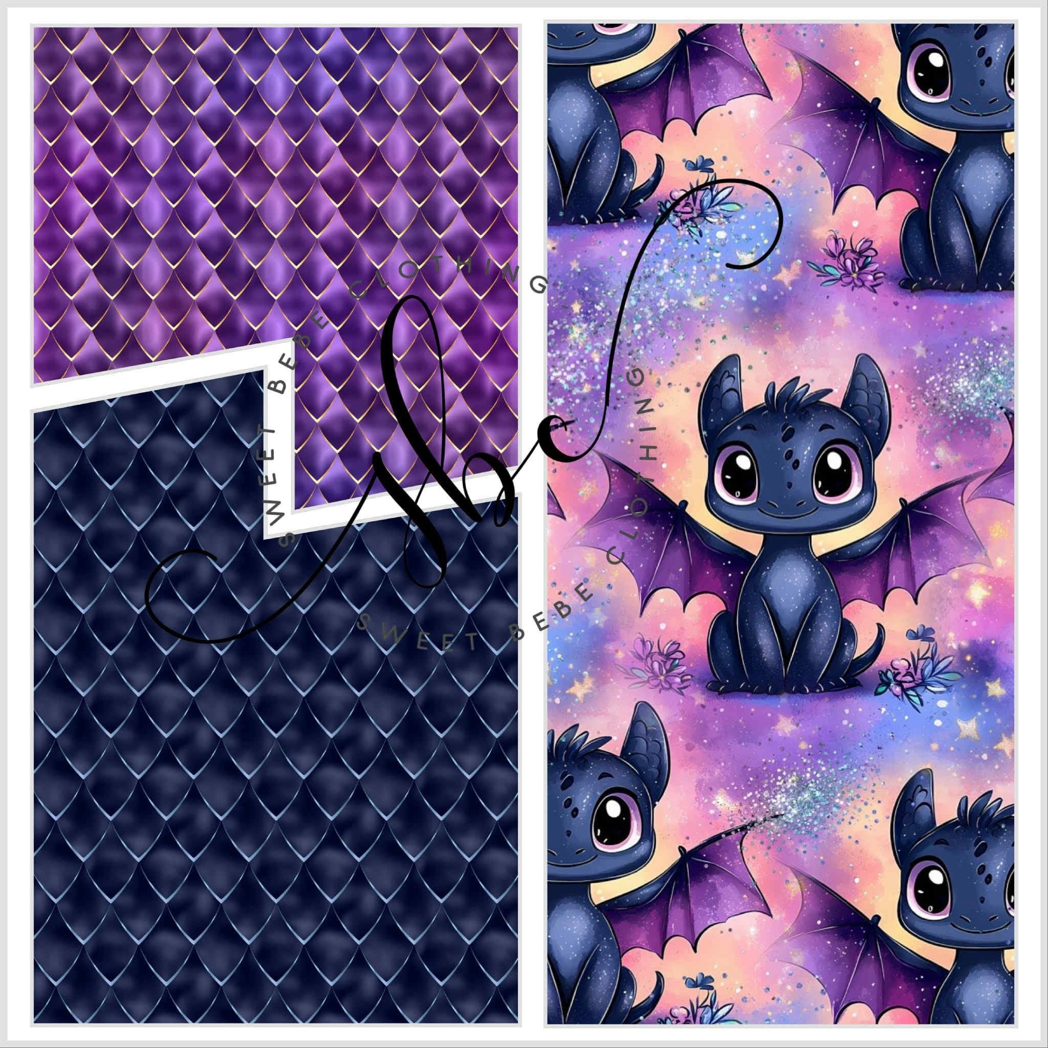 Size 7/8. Fabric A: tossed print, Fabric B: black scales, Fabric C: purple scales