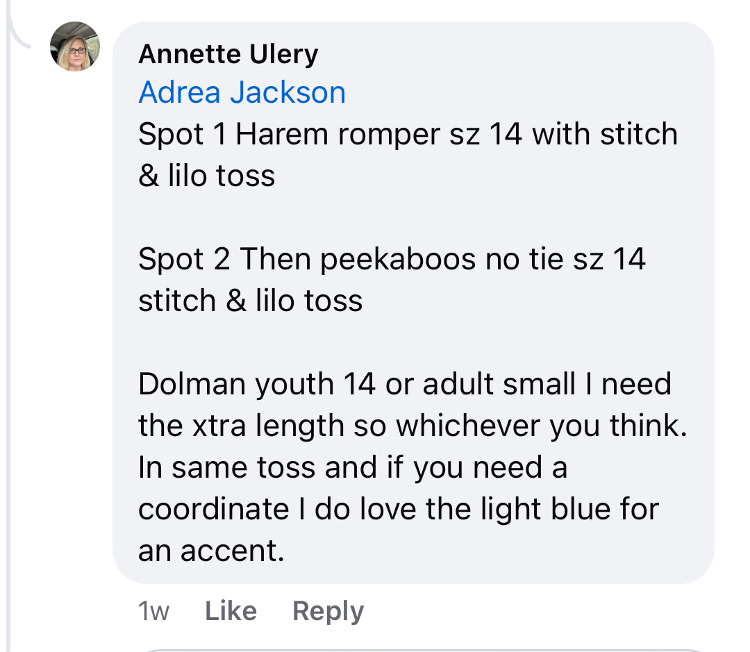 • Please see the attached size charts in the pinned album in the Facebook group before purchasing. Once an item is made in the size you selected, it can not be altered, returned or refunded due to size selection error. All sales are final.