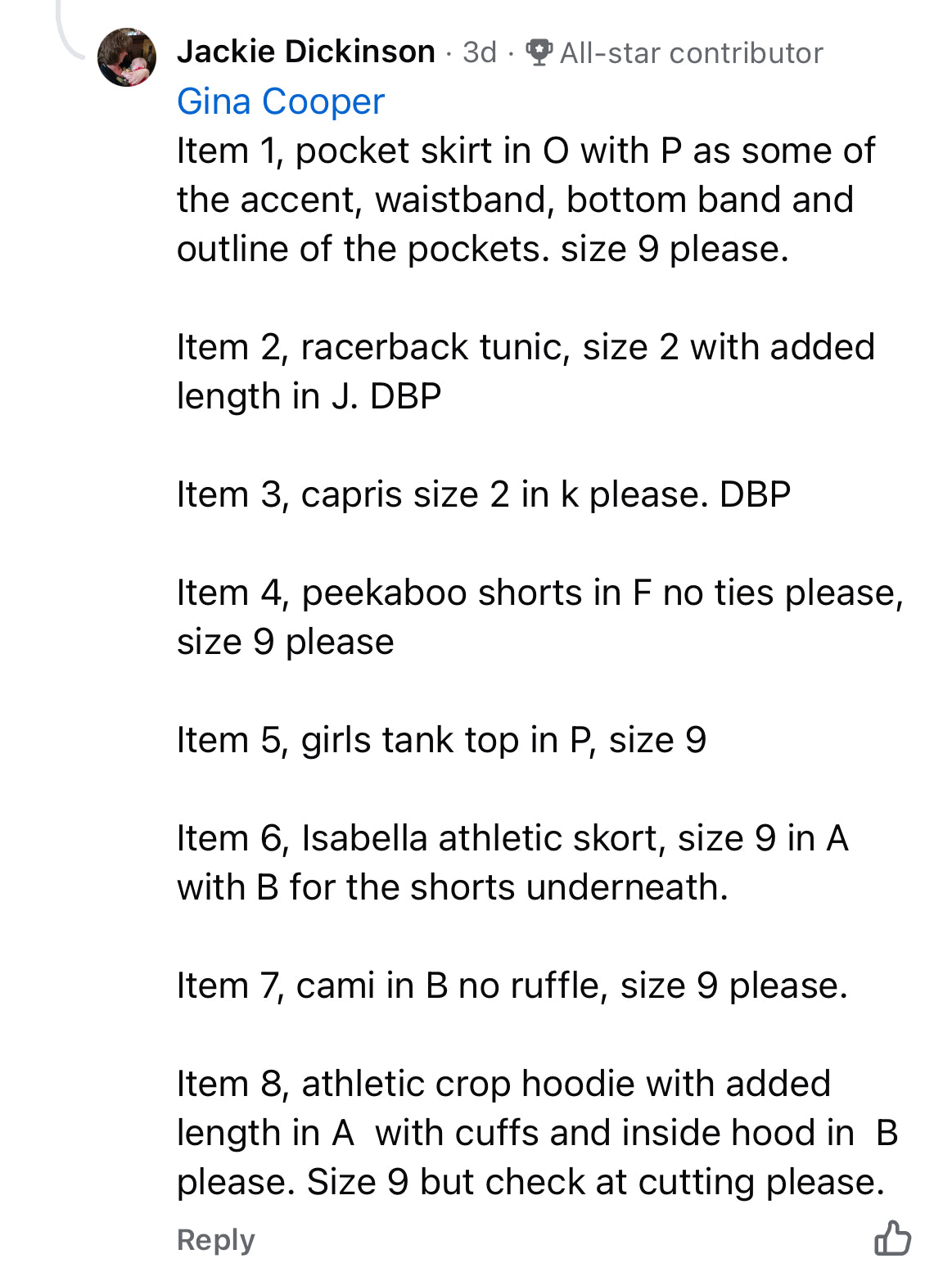 Item 8, athletic crop hoodie with added length in A with cuffs and inside hood in B please. Size 9 but check at cutting please. ($59)